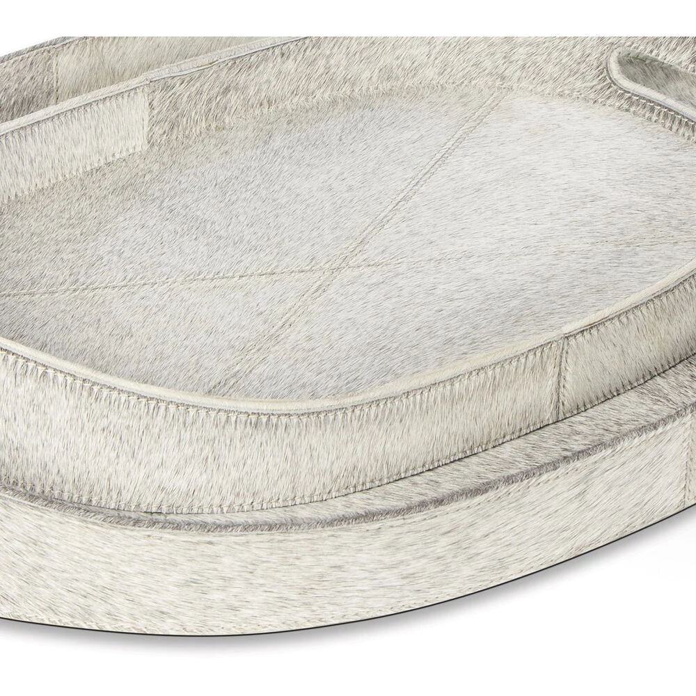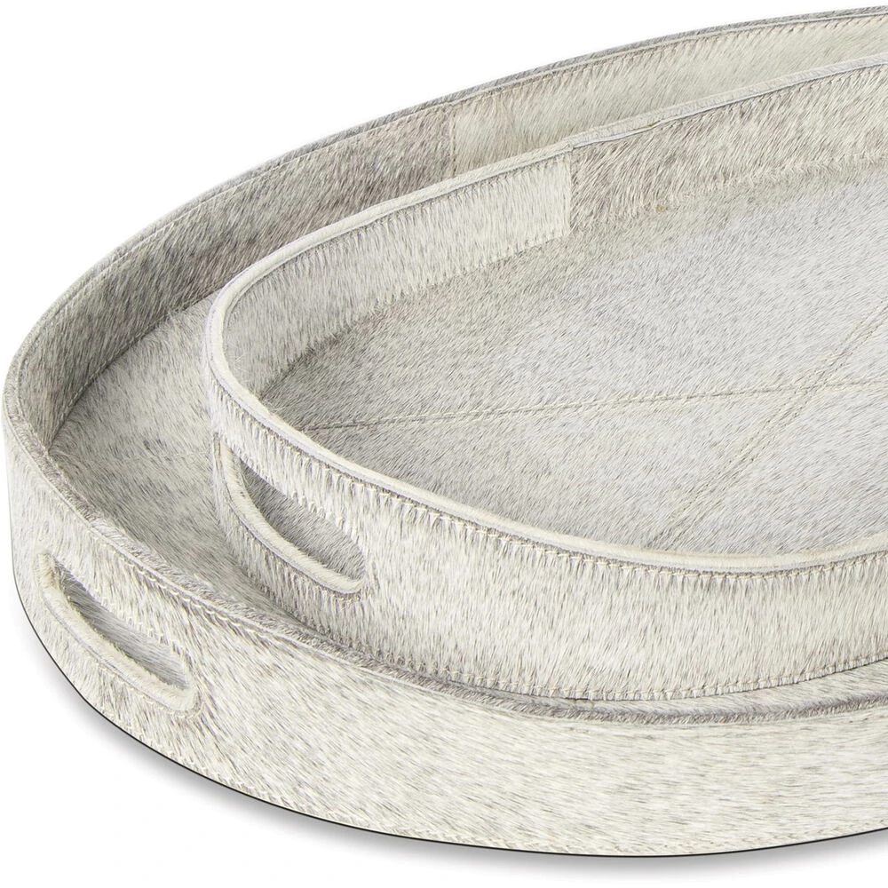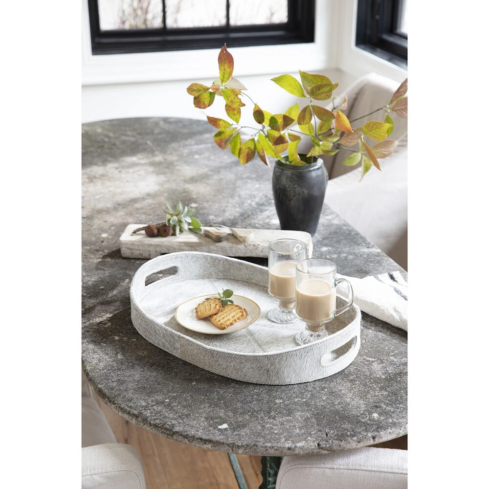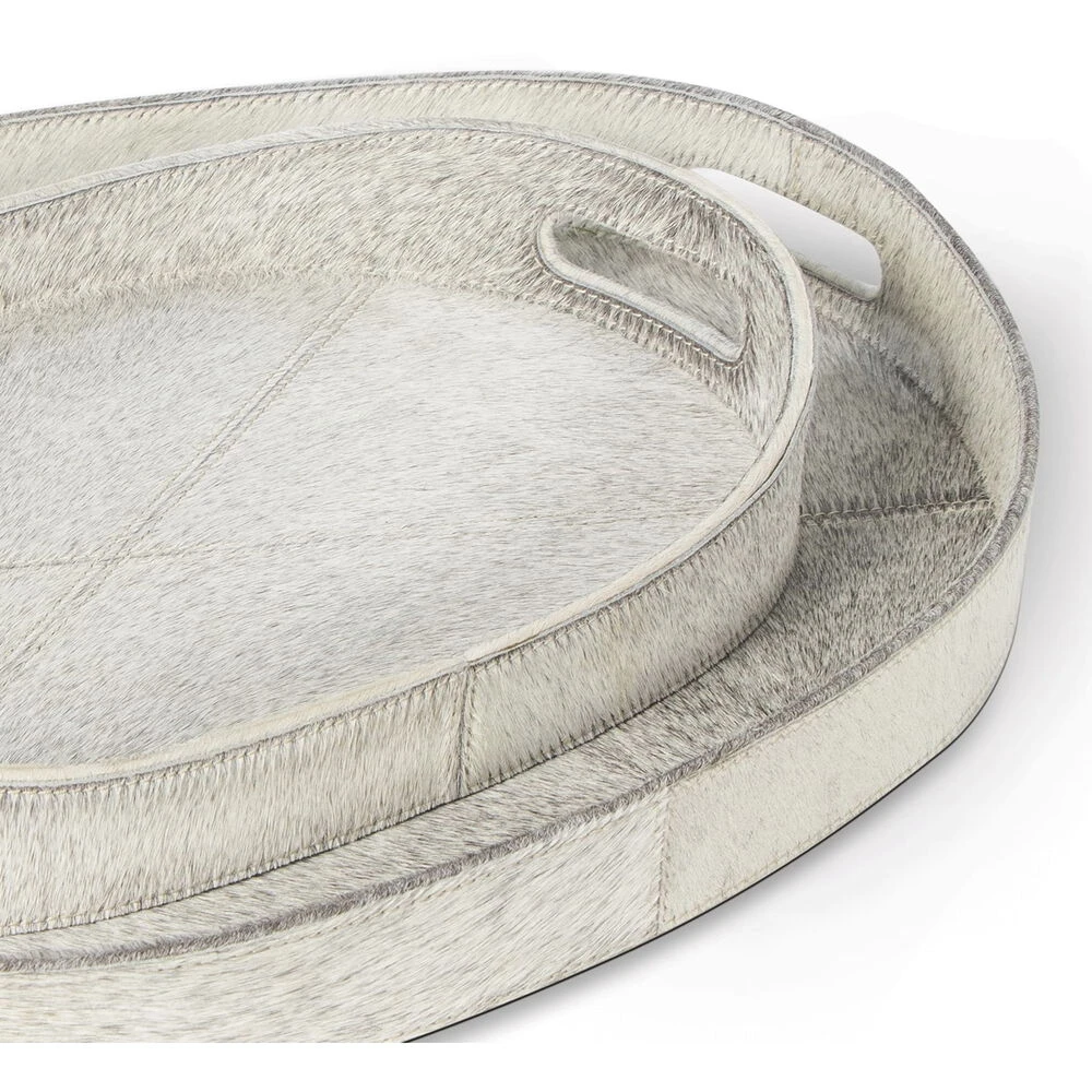 Inspired by the natural beauty and unique tones of grey hair on hide, these trays are perfect for displaying candles, drinks, books, and more. With handles for ease of serving or moving, these trays add a touch of luxury to a casual dinner party or for your everyday use.