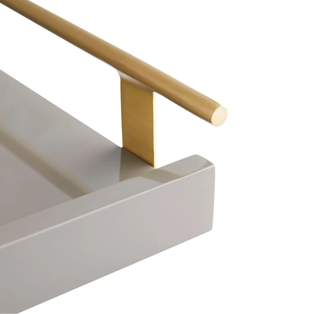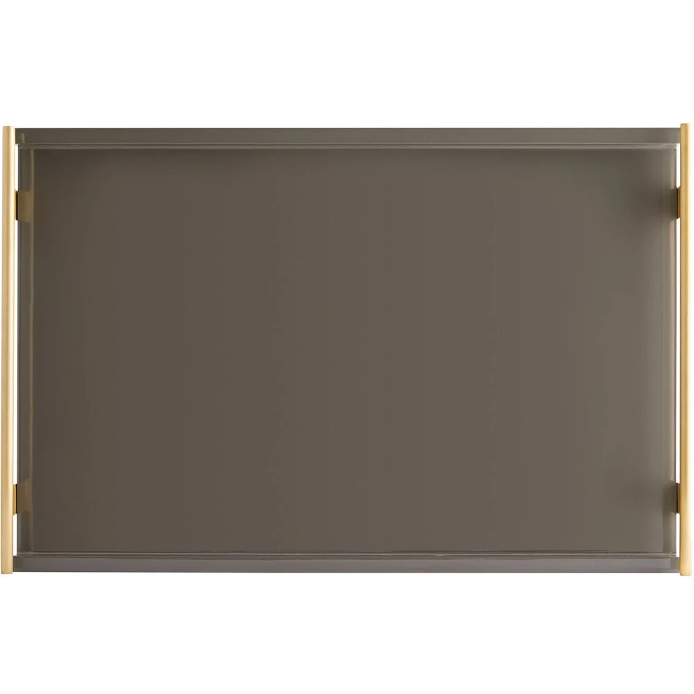 Form meets function to create this modern serving tray. A chateau gray lacquer finish is balanced by antique brass handles that offer a practical and polished appeal—an optimal serving piece when hosting casual or formal functions.