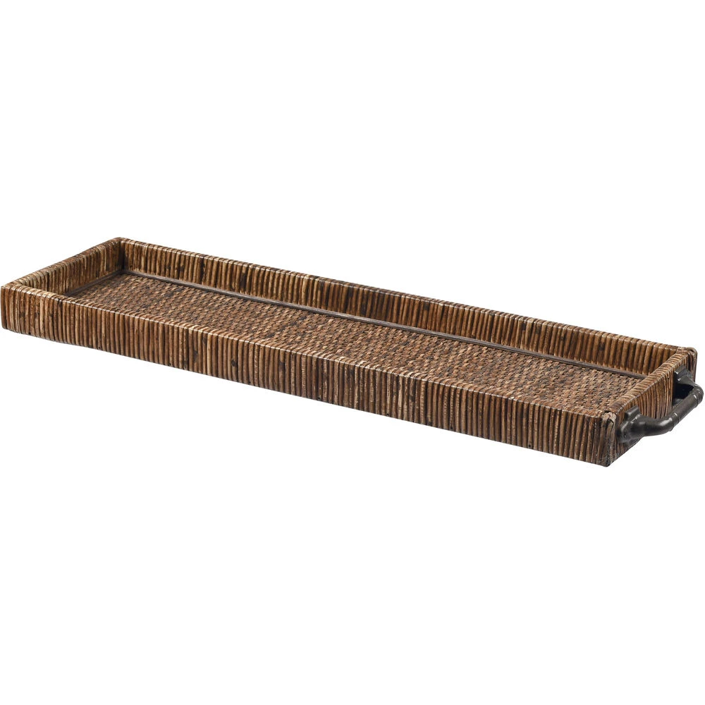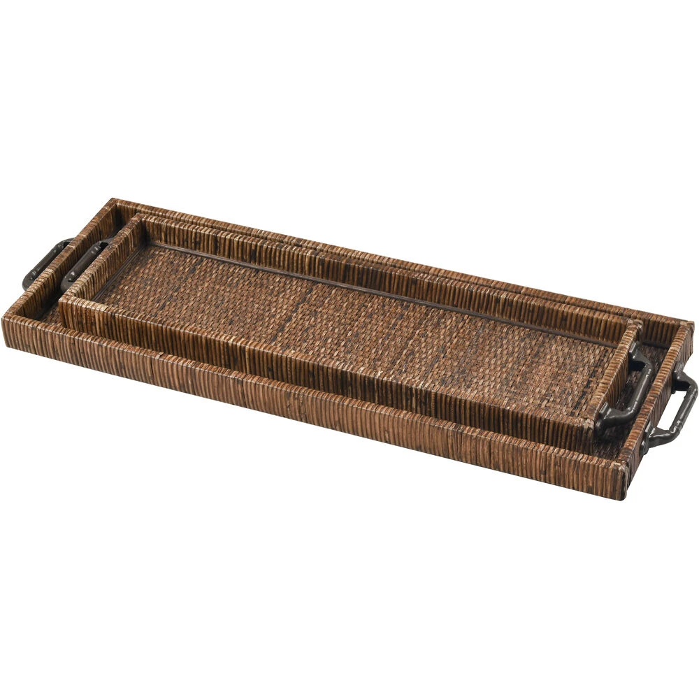 The Bowman Trays, sold as a set of two, are rectangular woven rattan nesting trays with a rich brown finish. With raised sides and handles for easy transport, these versatile trays work in a variety of environments.