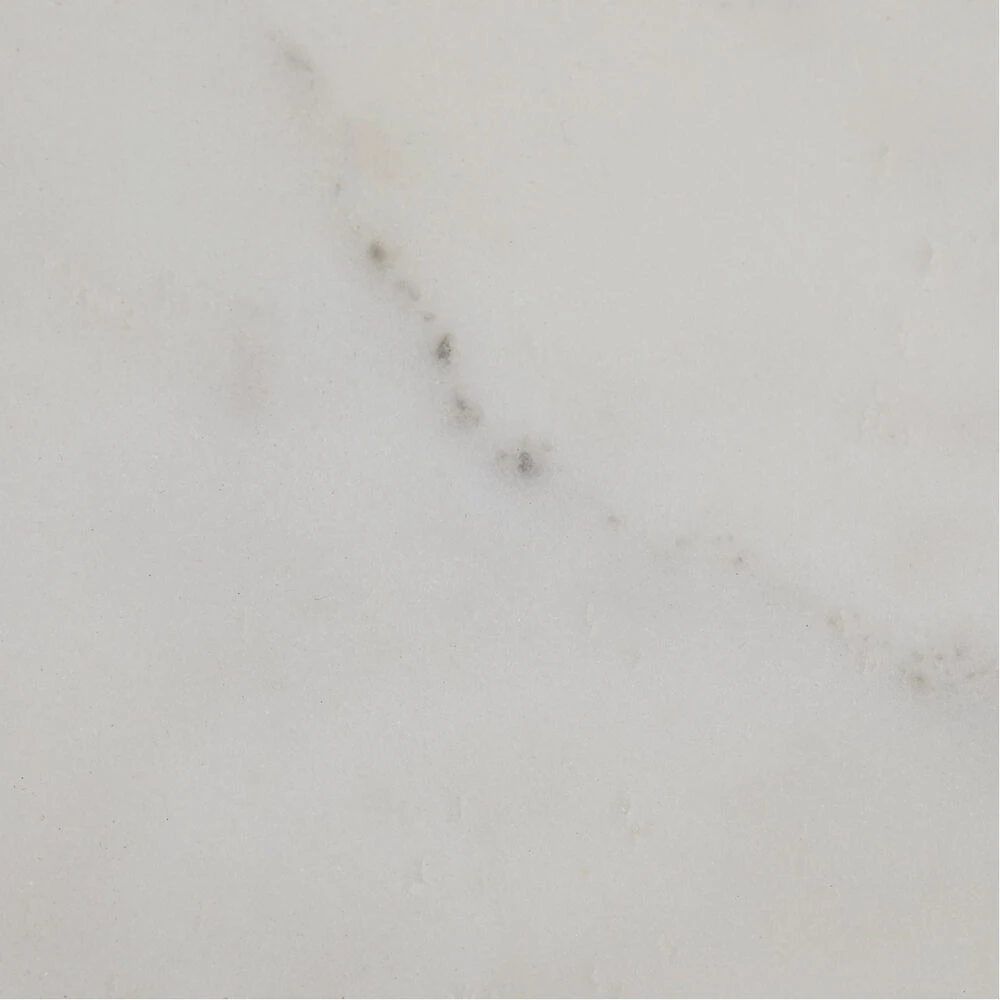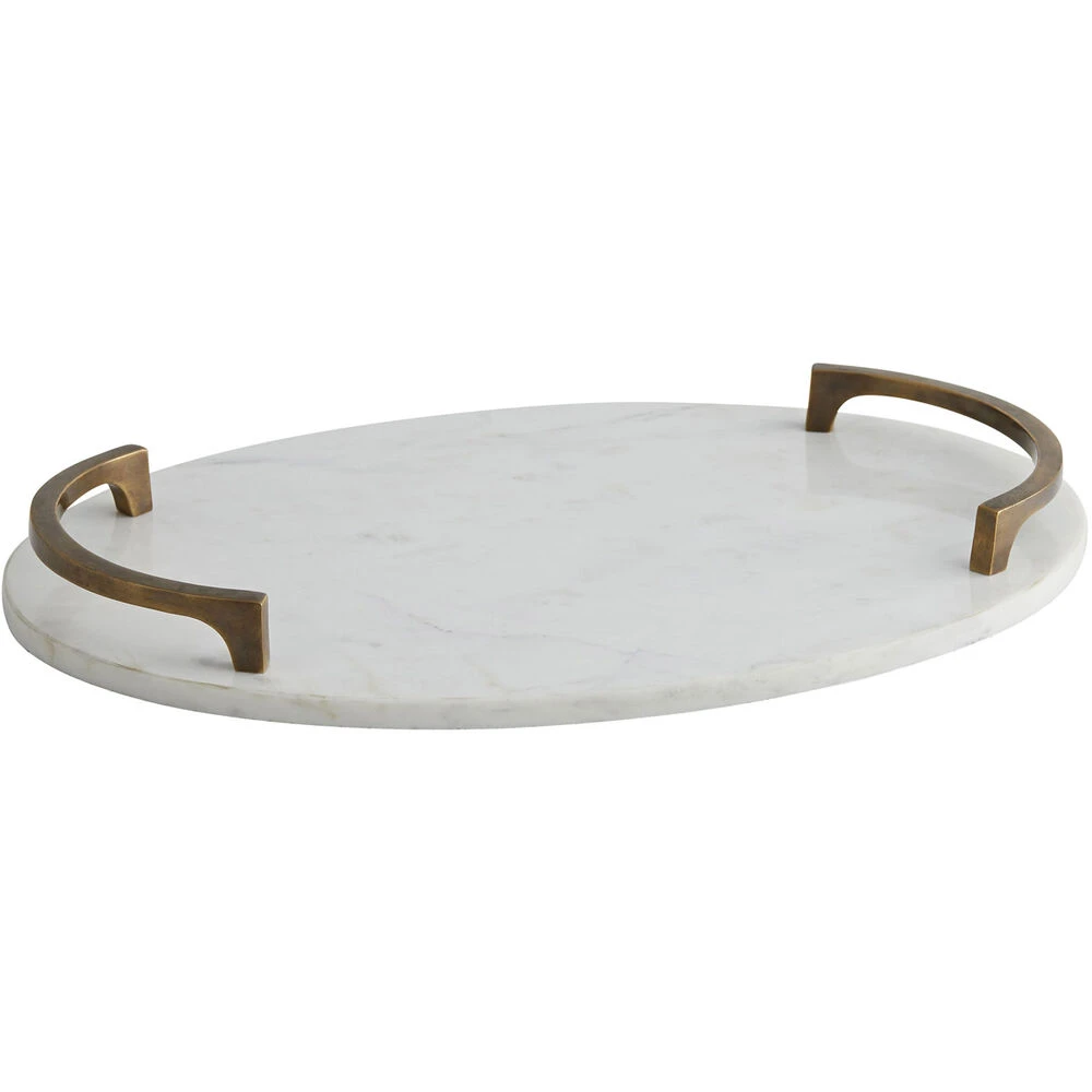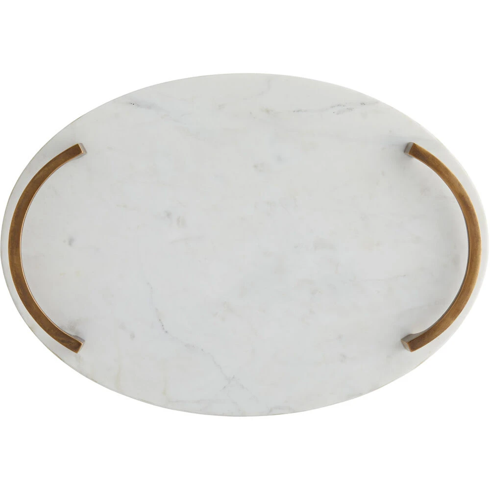 This polished white marble tray is balanced with vintage brass rail handles that follow its oval curvature. This piece acts as a sleek solution for serving guests or as a sophisticated platform for displaying objets d’art. Finish may vary.