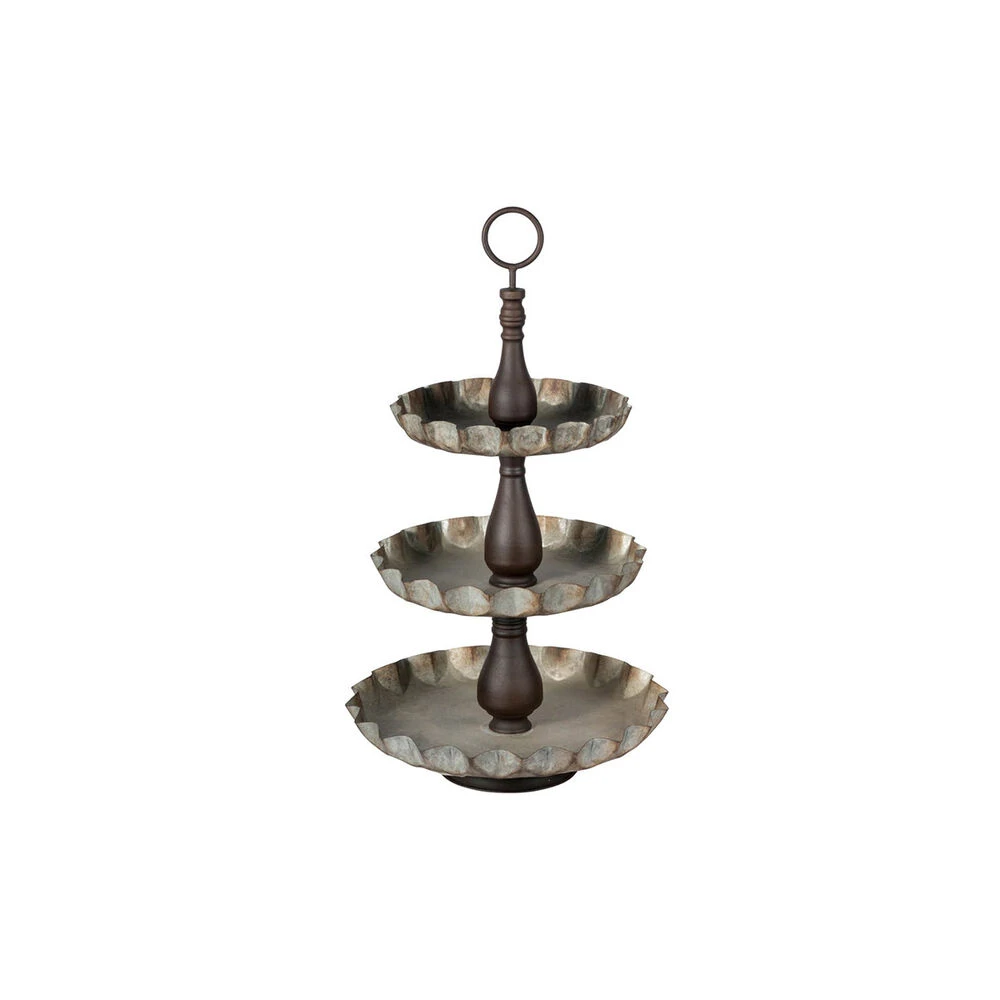 Durable iron construction, crimped edges, and vintage style make the Ellington Three-Tier Serving Tray a classic piece equally suitable for everyday use and special gatherings. Use to store fruits and vegetables, or create a unique centerpiece of flowers and decorative accents. The tray adds casual elegance to any event and offers an ideal way to present canapes, muffins, or finger sandwiches.