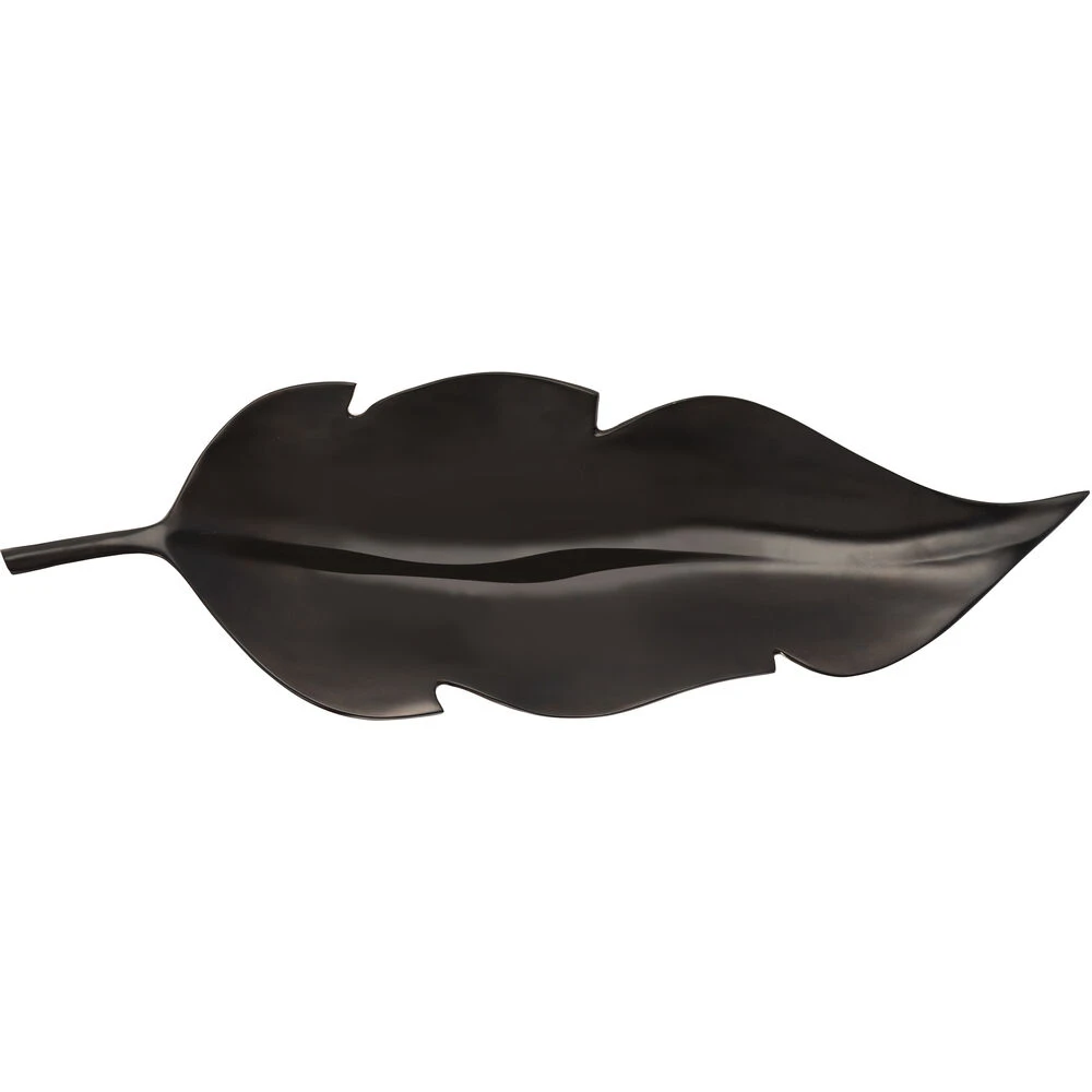 The Ennis Leaf Trays, sold as set of two, are large metal leaf sculptures that can be used to hold items or display on their own. The larger leaf has a dark bronze painted finish, and the smaller leaf has a matte brass finish.