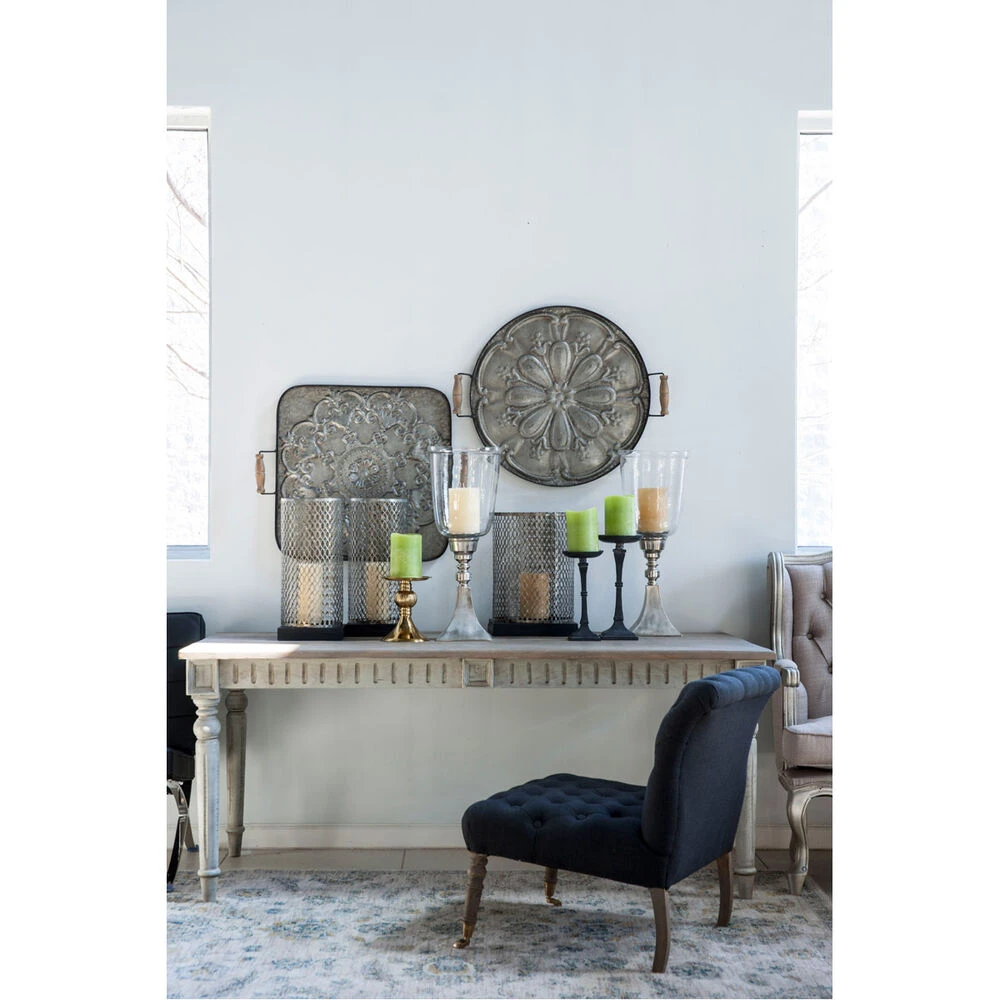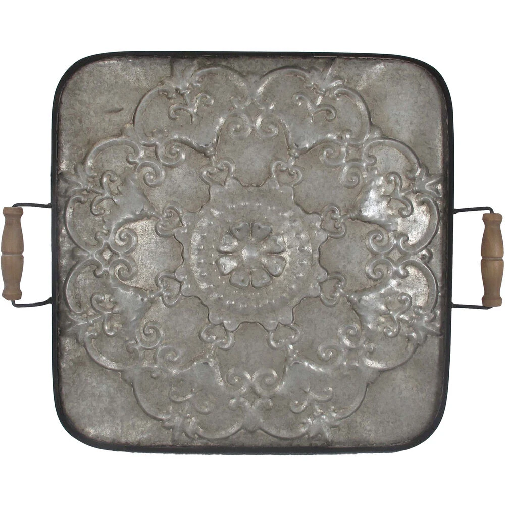 This square Fabius Tray features durable iron construction and an elegant, imprinted pattern for a classic look. Enjoy the convenient size of the Fabius Tray as it adds a vintage charm to your home and gatherings. with its slightly rustic look, this tray brings an understated sophistication to any decor.