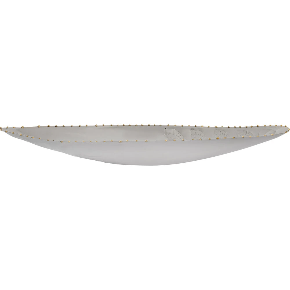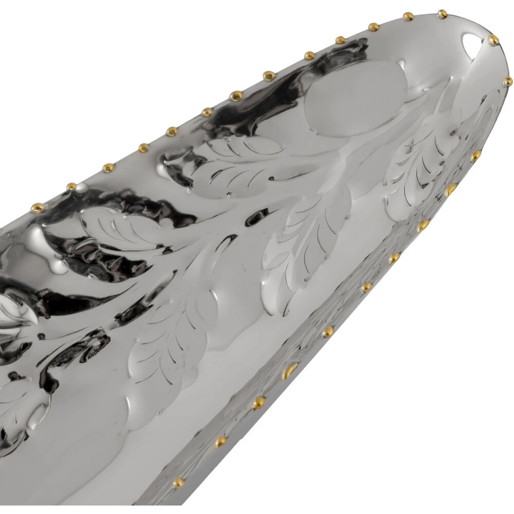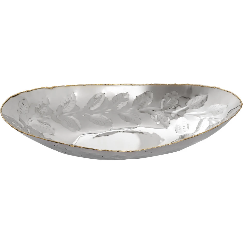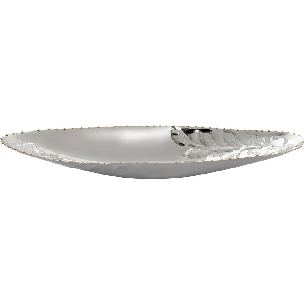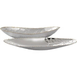 The Garza Trays, sold as a set of two, are made from metal with a silver finish. Each tray has an elongated organic shape, and each tray is rimmed with gold detailing, adding to their luxe appeal.