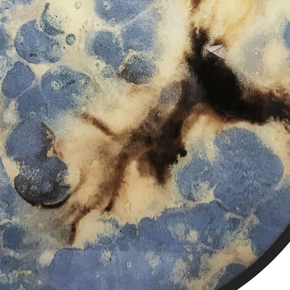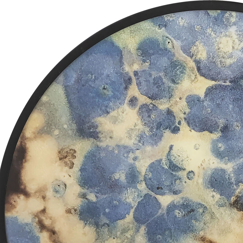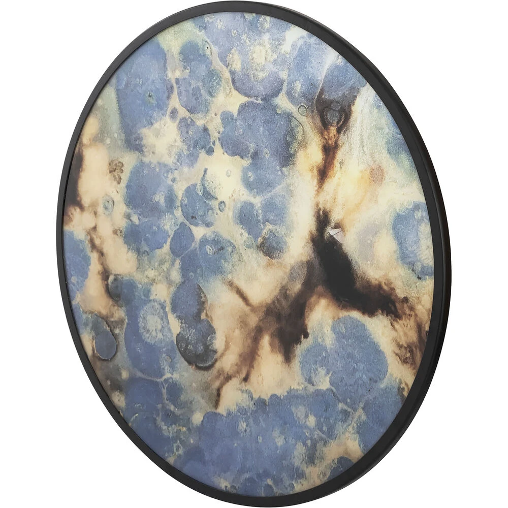 The Hargrove wall art/tray is a round metal piece featuring an abstract geometric painted interior. Watery splashes of gold, blue and brown painted into the tray’s interior make a dynamic artistic statement.