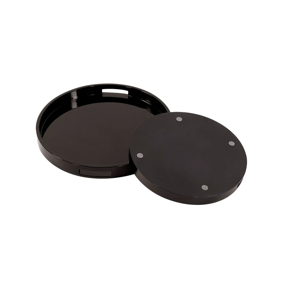 This tray set has an elegant round shape. The smooth wood is finished in a high gloss black lacquer. The simplicity of these trays allows them to fit right in with any decor style. From Contemporary, to Art Deco; from Transitional to a Scandinavian look, plus everything in between. The tray set includes one small and one large tray. Use them together or each on their own. Trays feature convenient cut out hand holds. Also available in White or Taupe.