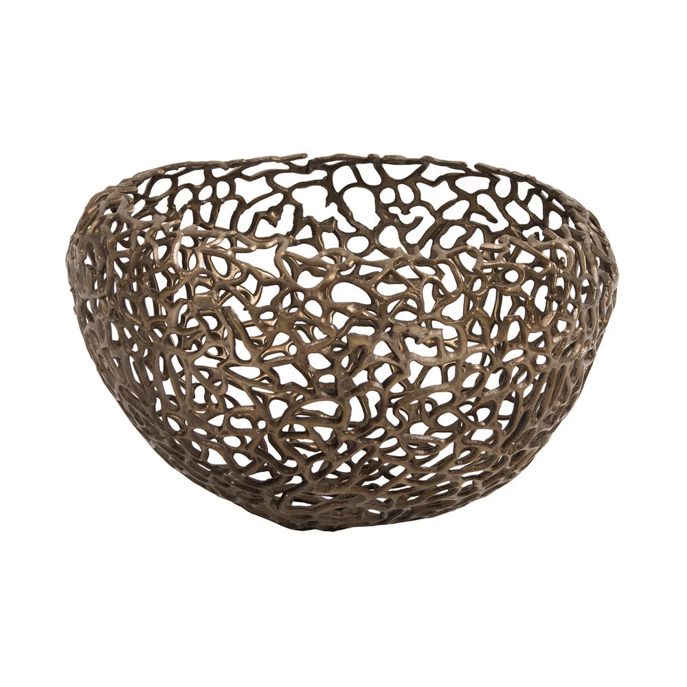 This bowl is fashioned from intertwined aluminum strips that come together to resemble a nest like shape. It is then finished in a lovely deep bronze. It is a great piece for a shelf or table to elegantly display the items inside. The bottom of the bowl is padded so as not to harm your surfaces. Also available in a silver and in a matching wall art piece.