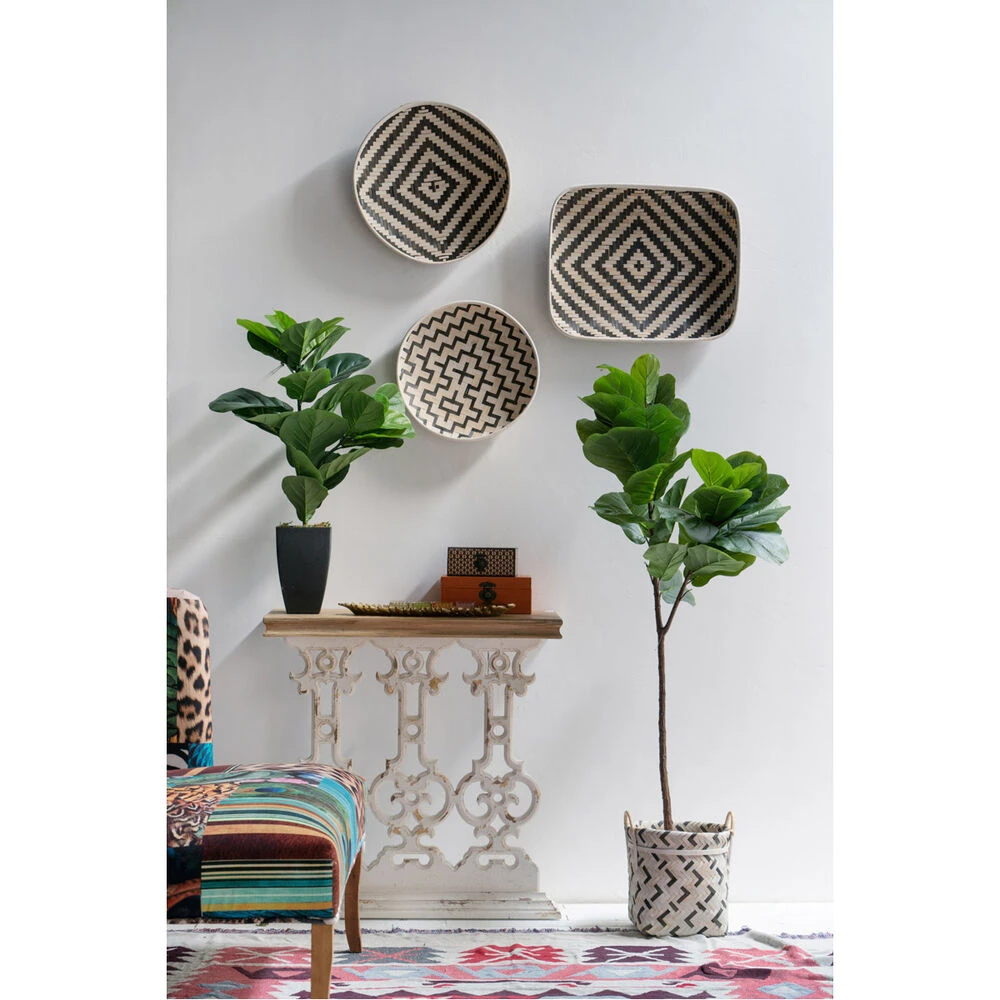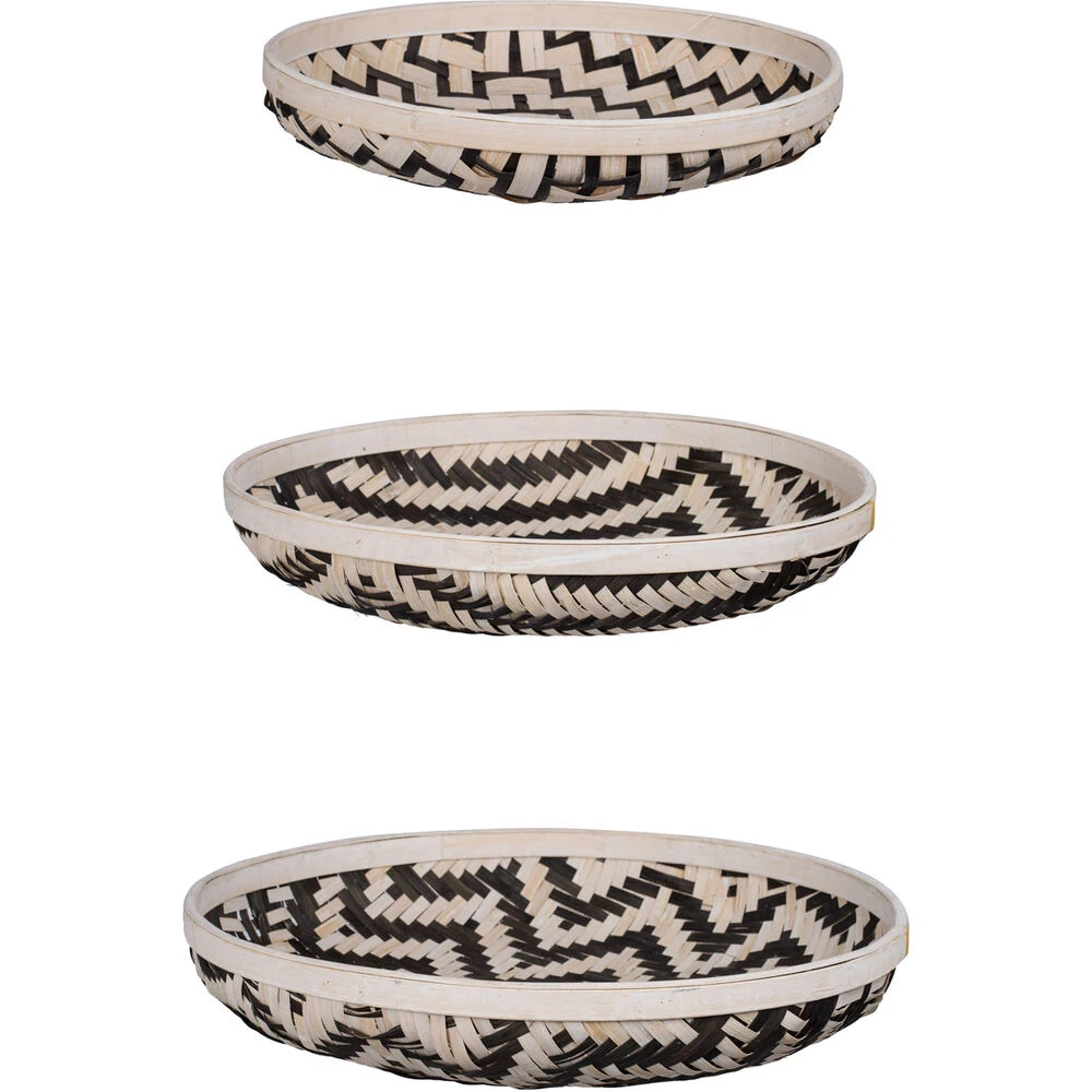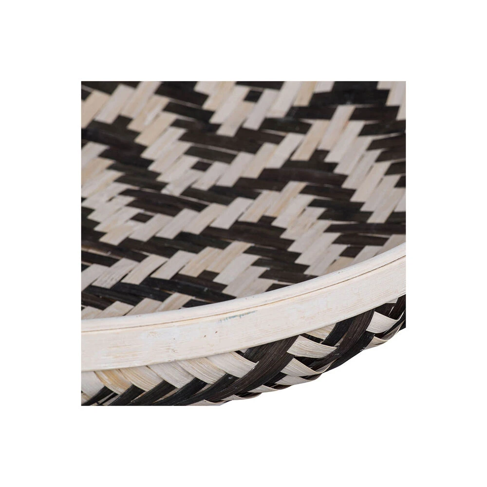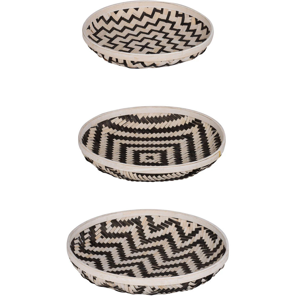 Decorate and organize your space with these neat trays in exciting geometric patterns. Constructed from durable woven bamboo, these round trays are great for multiple purposes ranging from serving to display. The black and white colorway is perfect for modern spaces while the exciting designs are sure to draw compliments from guests.