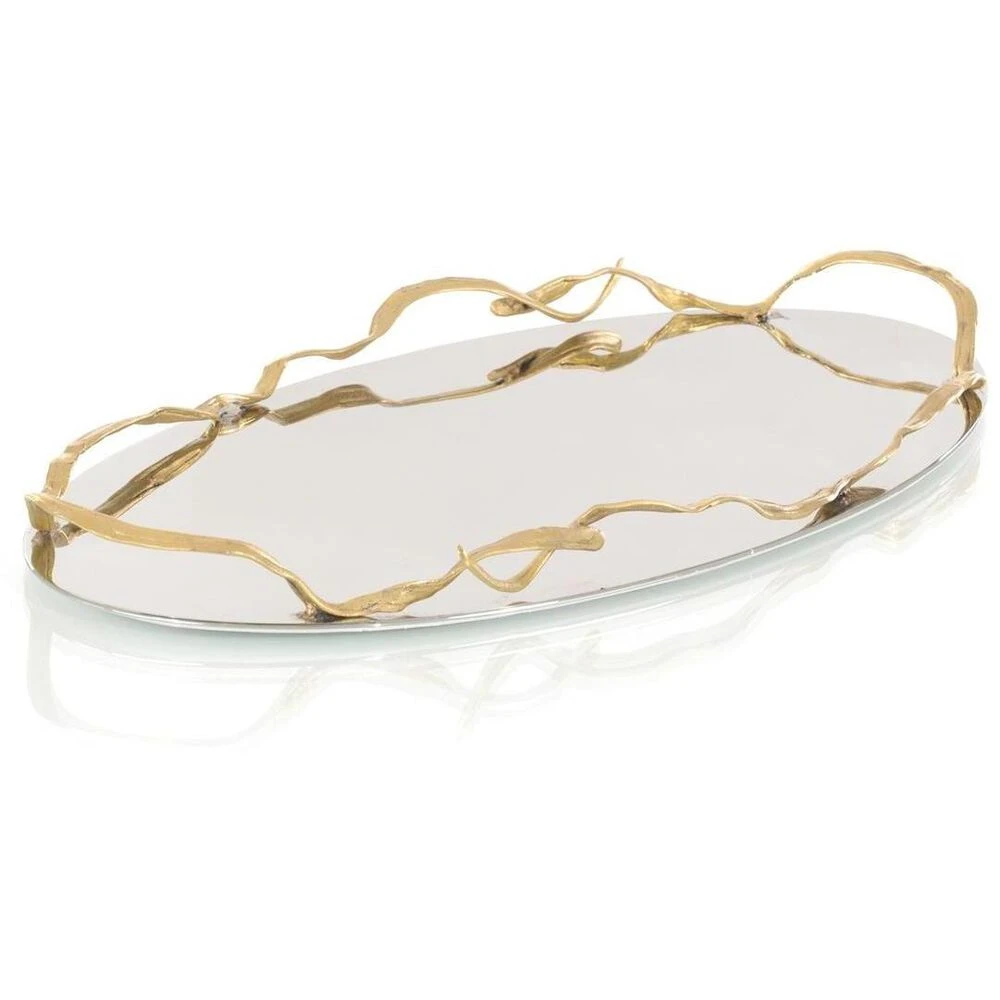 A rippled ribbon of brass encircles an oval tray in polished stainless steel.