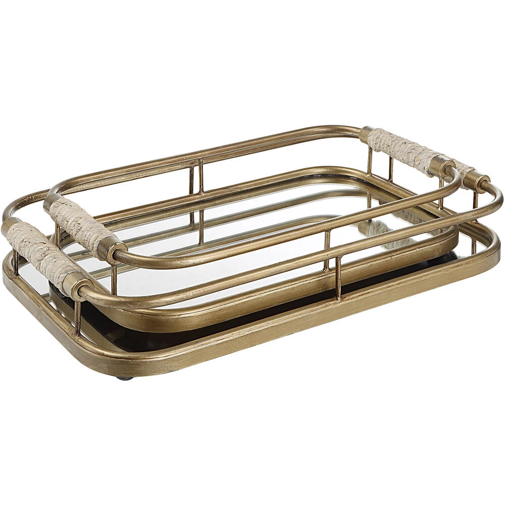 Set Of Two Metal Trays Are Finished In Brushed Gold With Natural Rope Wrapped Handles And Mirrored Bottoms. Sizes: S-17x3x10, L-20x3x11