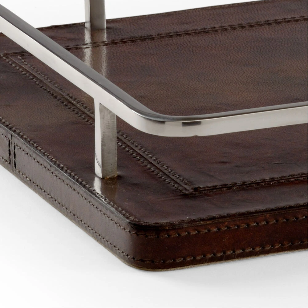 STOWAWAYS TRAY. DARK BROWN LEATHER RECTANGULAR TRAY WITH POLISHED NICKEL HARDWARE.